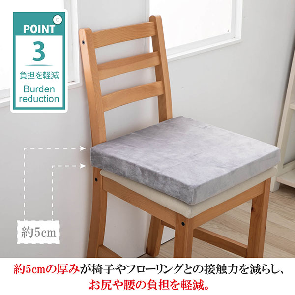 約5cmの厚みが椅子やフローリングとの接触力を減らし、お尻や腰の負担を軽減。