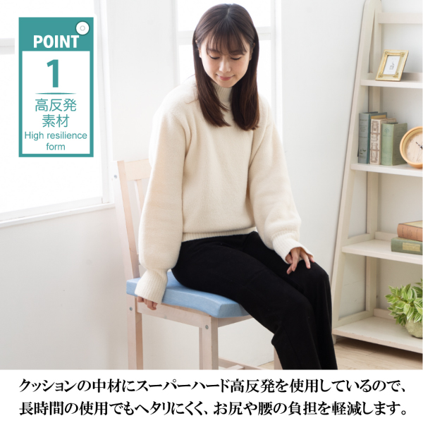 クッションの中材にスーパーハード 高反発 を使用しているので、長時間の使用でもヘタリにくく、お尻や腰の負担を軽減します。
