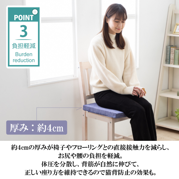 約4cmの厚みが椅子やフローリングとの直接接触力を減らし、お尻や腰の負担を軽減。