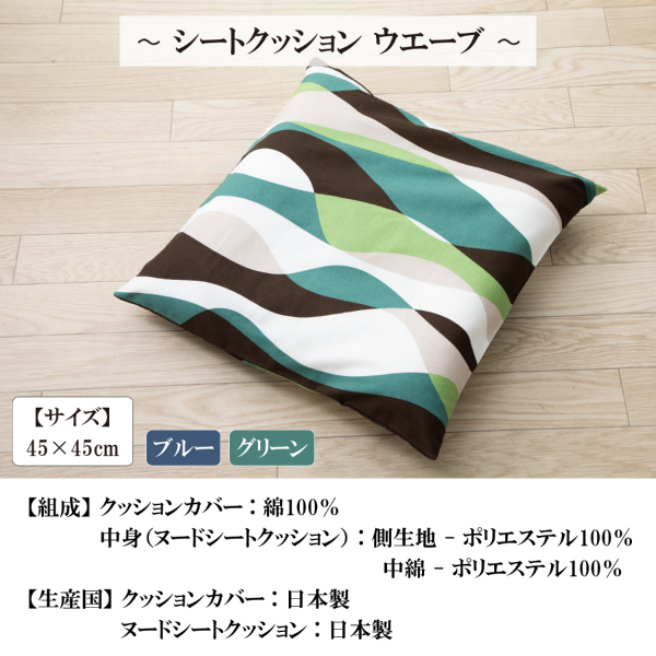【サイズ】45 × 45 ? 【組成】クッションカバー・・・綿100% 中身(ヌードシートクッション)・・・側生地 ポリエステル100% 中綿 ポリエステル100%【生産国】クッションカバー:日本製 ヌードシートクッション:日本製