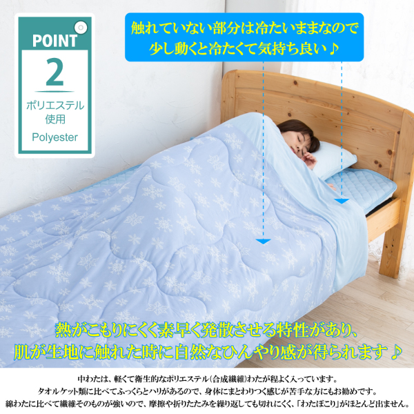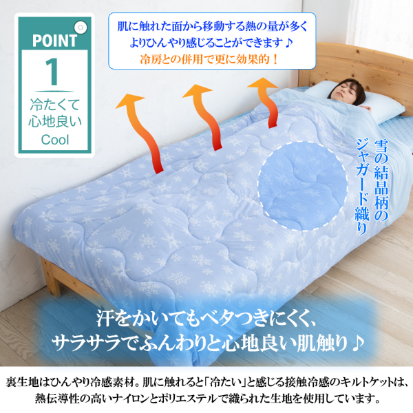 肌に触れると「冷たい」と感じる接触冷感のキルトケットです。