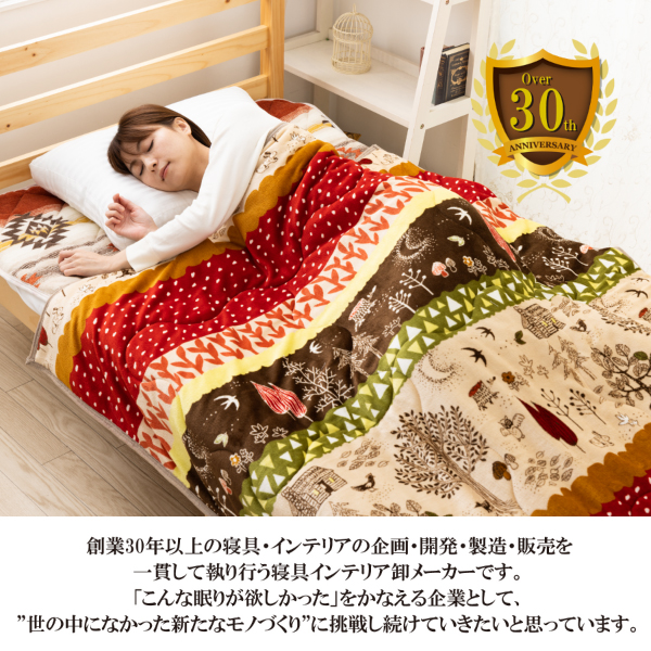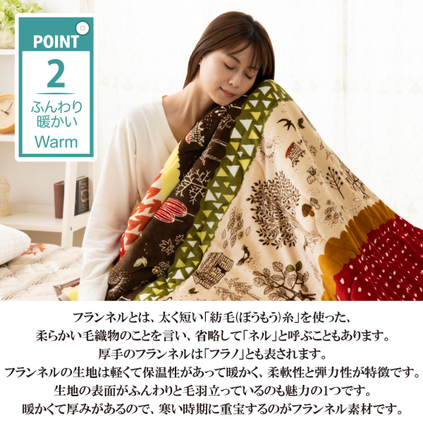 表生地と裏生地の間にポリエステル綿が入っている為、2枚合わせ毛布より暖かい。