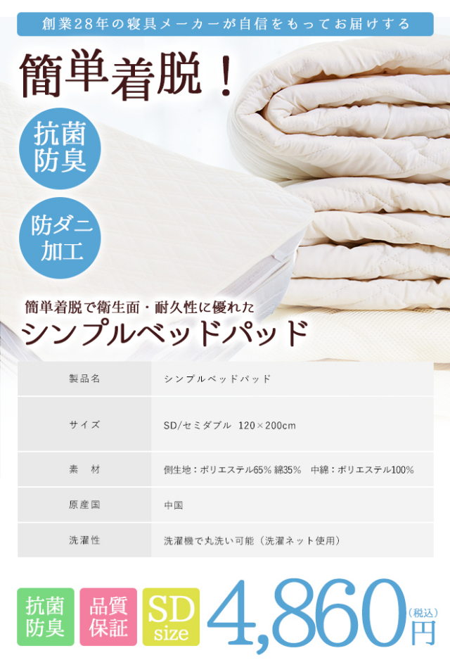 正規品 ベッドパッド 洗えて抗菌防臭防ダニ加工の清潔ベッドパッド セミダブルサイズ 120×200cm ツイル織り